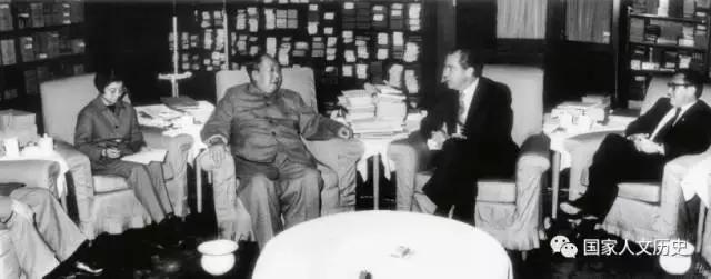 Mao recibiendo a Nixon y Kissinger en el estudio de la Casa junto a la piscina.