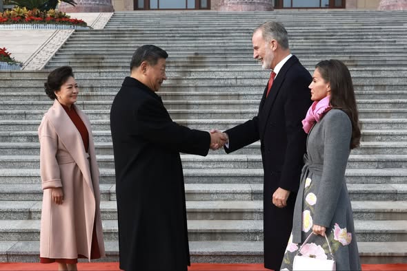 SS. MM. los reyes de España recibidos por el presidente Xi Jinping y su esposa al pie de los escalones del Gran Palacio del Pueblo en Pekín.