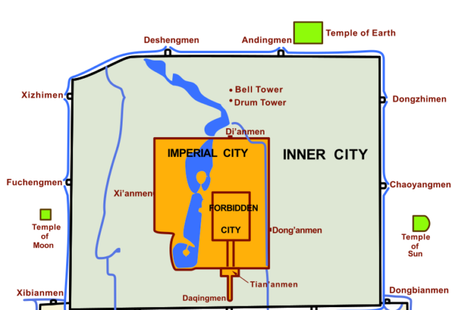 Al contrario de lo que se suele creer, este célebre edificio no es la entrada a la Ciudad Prohibida sino a la Ciudad Imperial, en cuyo centro se encuentra la Ciudad Prohibida, es decir, el Palacio Imperial donde se ubican el trono del Dragón y los aposentos del emperador.