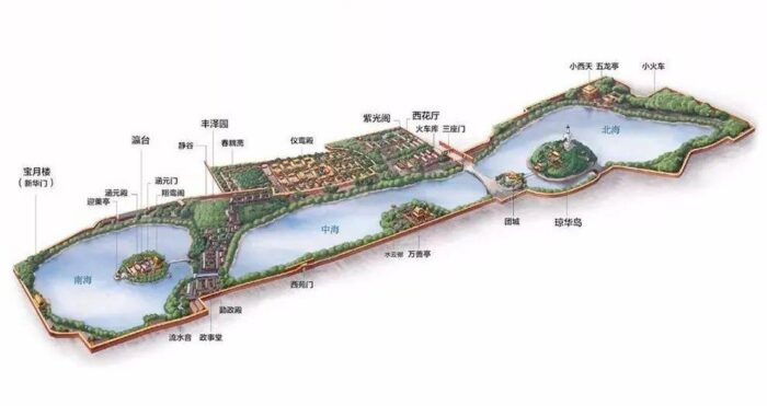 Unos 600 años atrás, Yongle, el tercer emperador de la dinastía Ming (1368-1644), trasladó la capital del imperio de la ciudad de Nankín a Pekín y construyó la actual Ciudad Prohibida. Anexo al lado occidental de la misma construyó también un inmenso jardín imperial con tres grandes lagos de norte a sur, llamados mares —el mar del Norte o Beihai (北海), el mar Central o Zhonghai (中海) y el mar del Sur o Nanhai (南海), conocidos en su conjunto como los tres mares o Sanhai (三海).